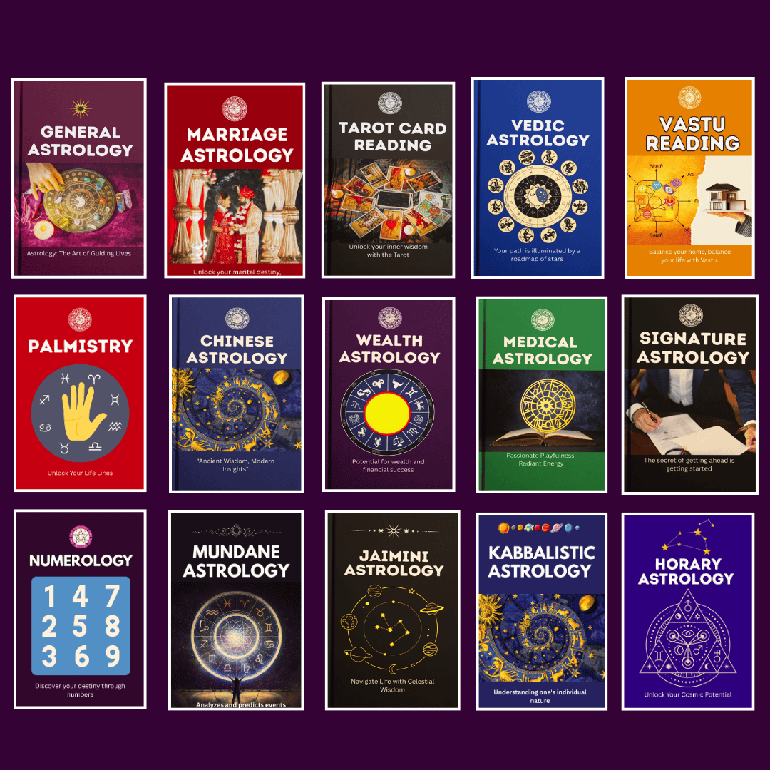 Vedic Astrology, Numerology, Tarot Reading, Palmistry, Vastu, Lal Kitab, Nakshatras, Zodiac Signs, Wealth Astrology, Medical Astrology, and many more — 80+ eBooks covering all major astrology branches.